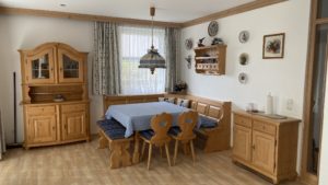 Apartmán je určen pro max 6 osob. Obývací pokoj a jídelna: lavice s jídelním stolem, komoda, pohodlná sedací souprava s možností spaní pro 2 osoby, vchod na terasu s výhledem na horský masív Grimming. Ložnice: dvoulůžková postel, vestavěné skříně. Pokoj: 2 lůžka /palanda/ (800x200cm), skříň. Kuchyň plně vybavená + lednička, myčka nádobí, 4plotýnkový vařič, elektrická trouba, mikrovlnná trouba. Koupelna: sprchový kout, umyvadlo, WC. Terasa: stolek a židle pro relaxaci.