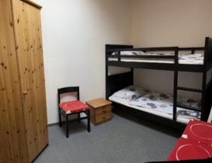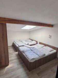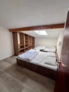 Ložnice č.1: 4 postele (90x200cm), vestavěné skříně, samostatné WC s umyvadlem.