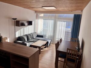 Obývací pokoj: jídelní stůl a židle, rozkládací pohovka (140x200cm), vchod na balkon s výhledem na horský masív.