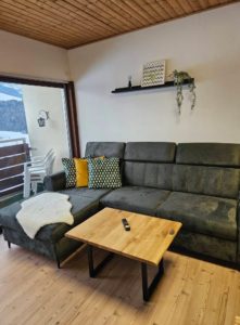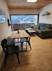Obývací pokoj: jídelní stůl, židle, lavice, rozkládací pohovka (140x200cm), vchod na balkon s výhledem na horský masív.