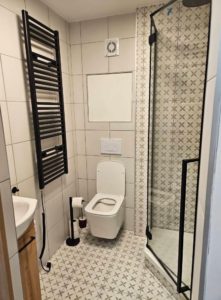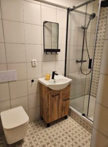 Koupelna v přízemí a patře: sprchový kout, umyvadlo, WC.